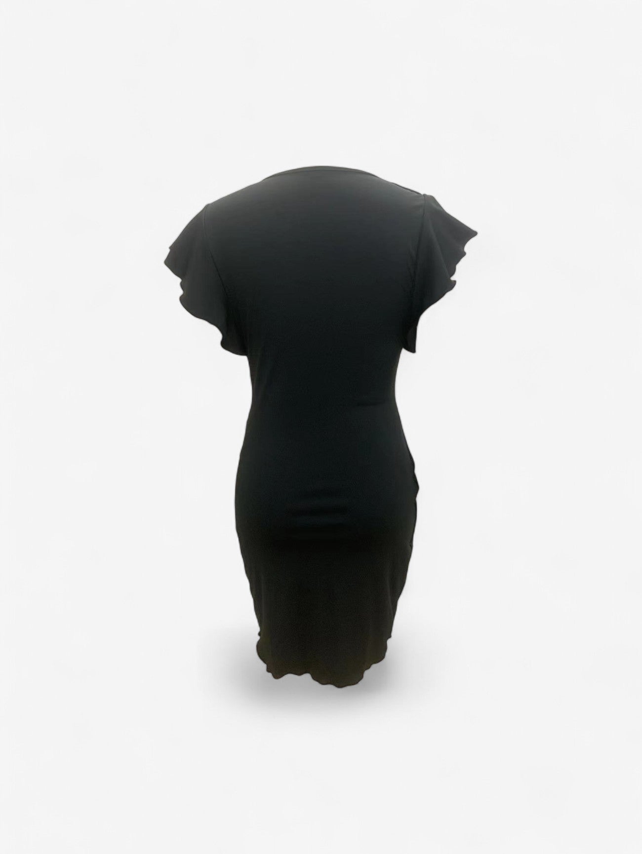Design: Slim-fit bodycon, V-neck, ruffle cap sleeves, side ruching, flared hemline